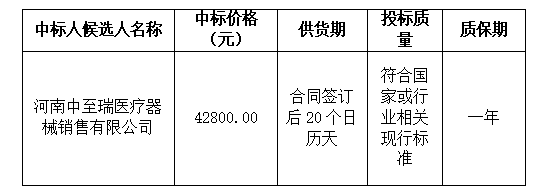 2025年12月15日在开封市陇海医院行政楼三楼会议室依法进行开标和评标活动。定标候选人公示期满后,定标委员会按照定标原则、方法和程序,于2025年12月22日在开封市陇海医院行政楼三楼会议室通过核查随机法进行定标。现将本次中标结果公示如下。